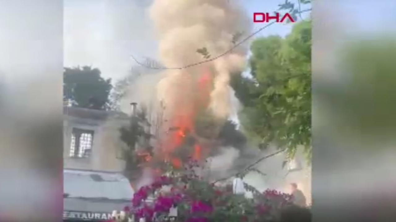 Fatih Sultanahmet Meydanı’ndaki bir restoranda yangın çıktı. İtfaiye ekiplerinin çalışmaları sürüyor. (DHA)