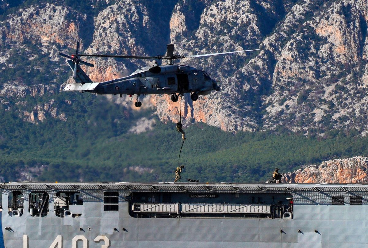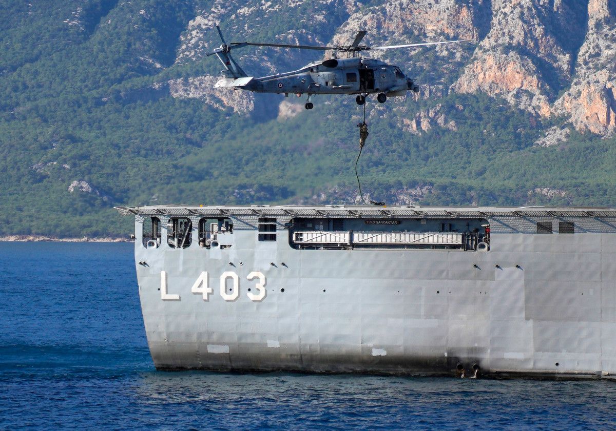 Bu sırada tatbikata katılan askeri helikopterler de senaryo gereği belirlenen alanları vurup, deniz piyade birliklerini alana indirdi.