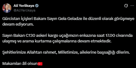 İçişleri Bakanı Ali Yerlikaya, uçağın enkazına saat 17.00 civarında ulaşıldığını ve arama kurtarma çalışmalarına devam edildiğini duyurdu. Bakan Yerlikaya, konuya ilişkin sosyal medya hesabından yaptığı açıklamada, “Gürcistan İçişleri Bakanı Sayın Gela Geladze ile düzenli olarak görüşmeye devam ediyorum. Sayın Bakan C130 askeri kargo uçağımızın enkazına saat 17.00 civarında ulaşmış ve arama kurtarma çalışmalarına devam etmektedir. Şehitlerimize Allahtan rahmet, Milletimize, ailelerine başsağlığı dilerim. Makamları âli olsun” ifadelerine yer verdi.