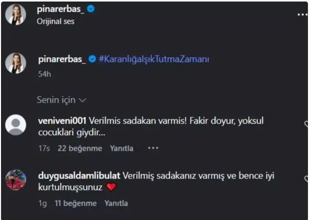 Pınar Erbaş’ın paylaşımlarının altına çok sayıda kullanıcı aynı ifadeyi yazdı: “Verilmiş sadakanız varmış.”