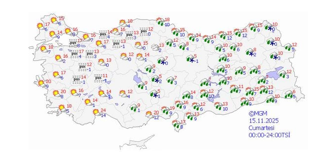 Meteoroloji Genel Müdürlüğü, 15 Kasım Cumartesi için ülke genelinde hava tahmin raporunu yayımladı. Yapılan değerlendirmeye göre, parçalı bulutlu bir hava hakim olacak. Kıyı Ege ile Edirne, Kırklareli, Çanakkale çevreleri, Erzurum, Muş ve Bitlis’in doğu ilçeleri, Kars, Ağrı ve Van’ın batı kesimlerinde sağanak ve gök gürültülü sağanak yağış bekleniyor. Hava sıcaklıklarının mevsim normallerinin üzerinde seyretmesi öngörülüyor.