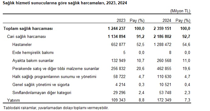 Toplam sağlık harcaması 2024 yılında bir önceki yıla göre %89,6 artarak 2 trilyon 359 milyar 151 milyon TL’ye yükseldi. Genel devlet sağlık harcaması %86,1 artarak 1 trilyon 794 milyar 227 milyon TL’ye ulaştı. Özel sektör sağlık harcaması ise %101,8’lik bir artış oranı ile 564 milyar 924 milyon TL olarak tahmin edildi.