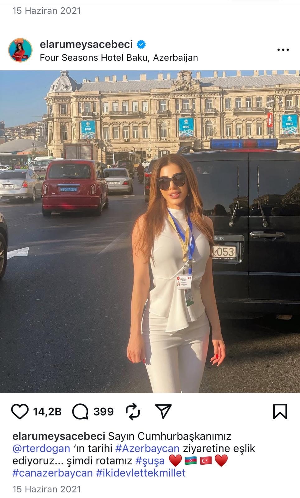 Cebeci, sunuculuk dışında hiçbir gazetecilik tecrübesi olmadığı halde Erdoğan’ın 15-18 Haziran 2021 arasındaki Azerbaycan ziyaretine davet edilmiş. Ziyaretin birinci günü İnstagram hesabında paylaştığı fotoğrafın altına şöyle yazıyor: