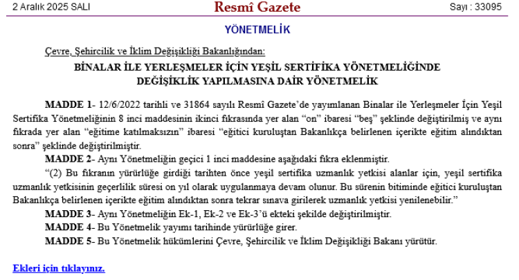 Yönetmelik değişikliğine göre; yeşil sertifika uzmanlık yetkisi süresi 10 yıldan 5 yıla indirilirken, eğitim şartları da güncellendi